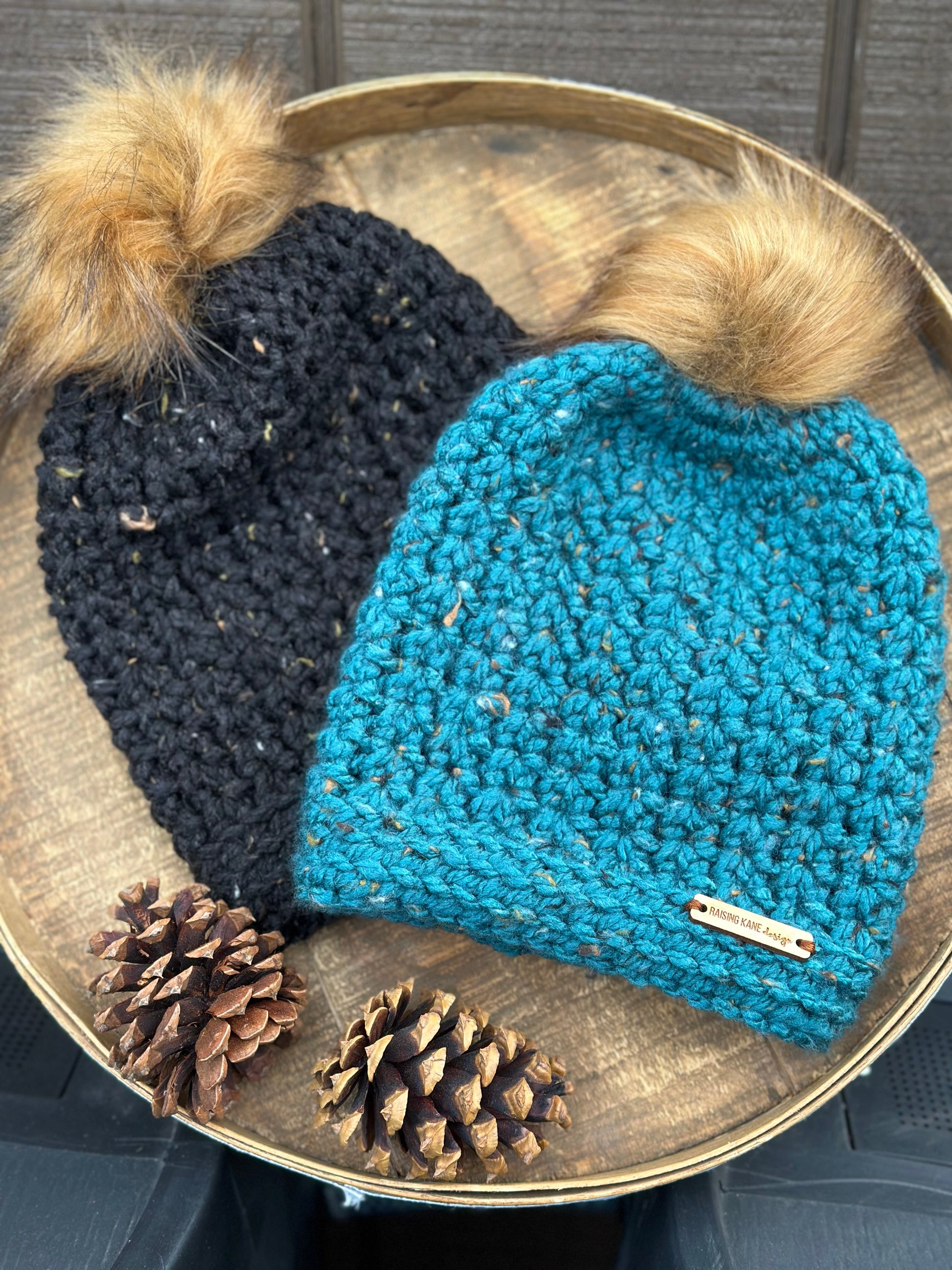 Choose between Teal Tweed and Black tweed both with a fleck of gold thread matching the removable faux fur pom.