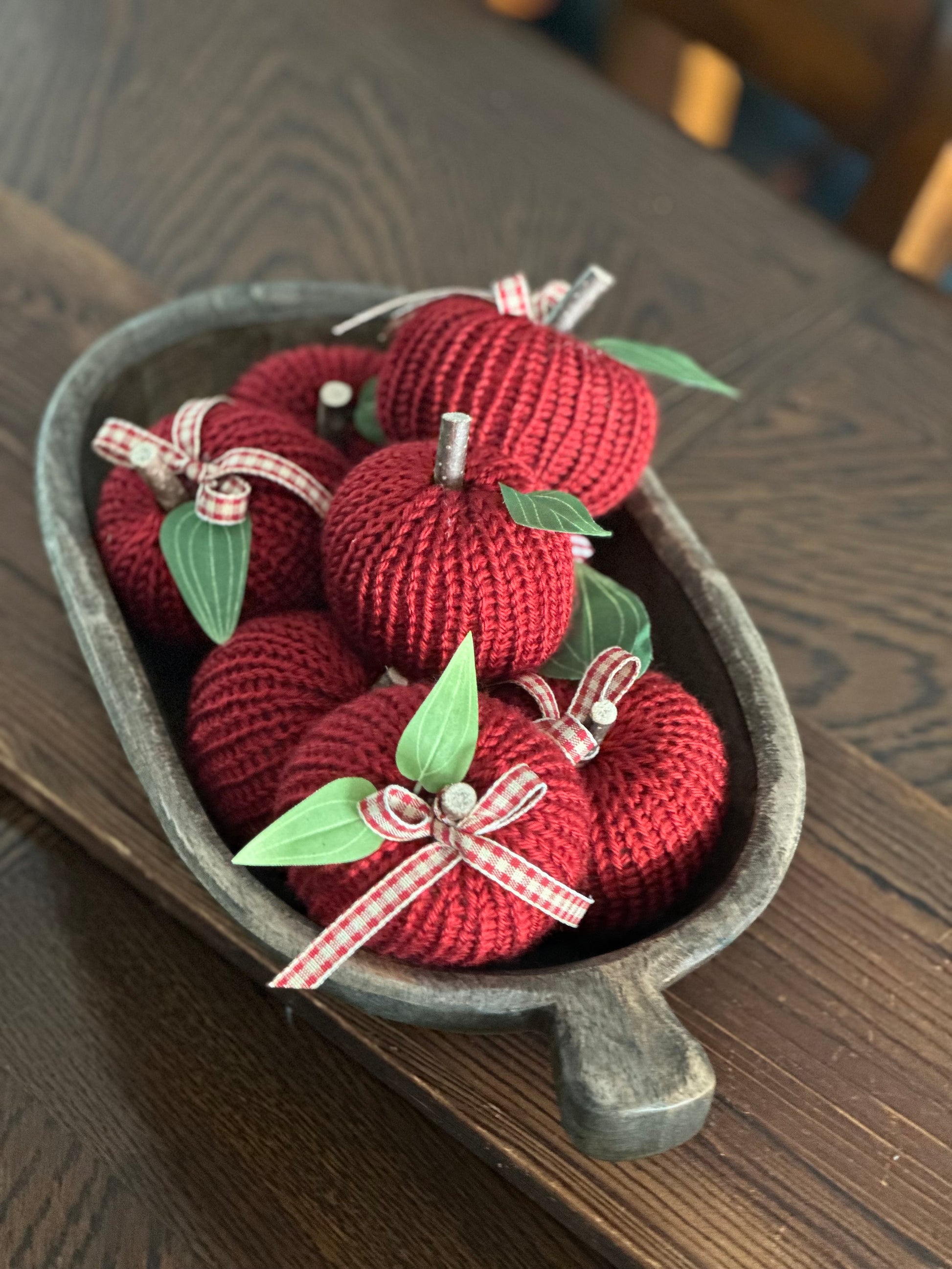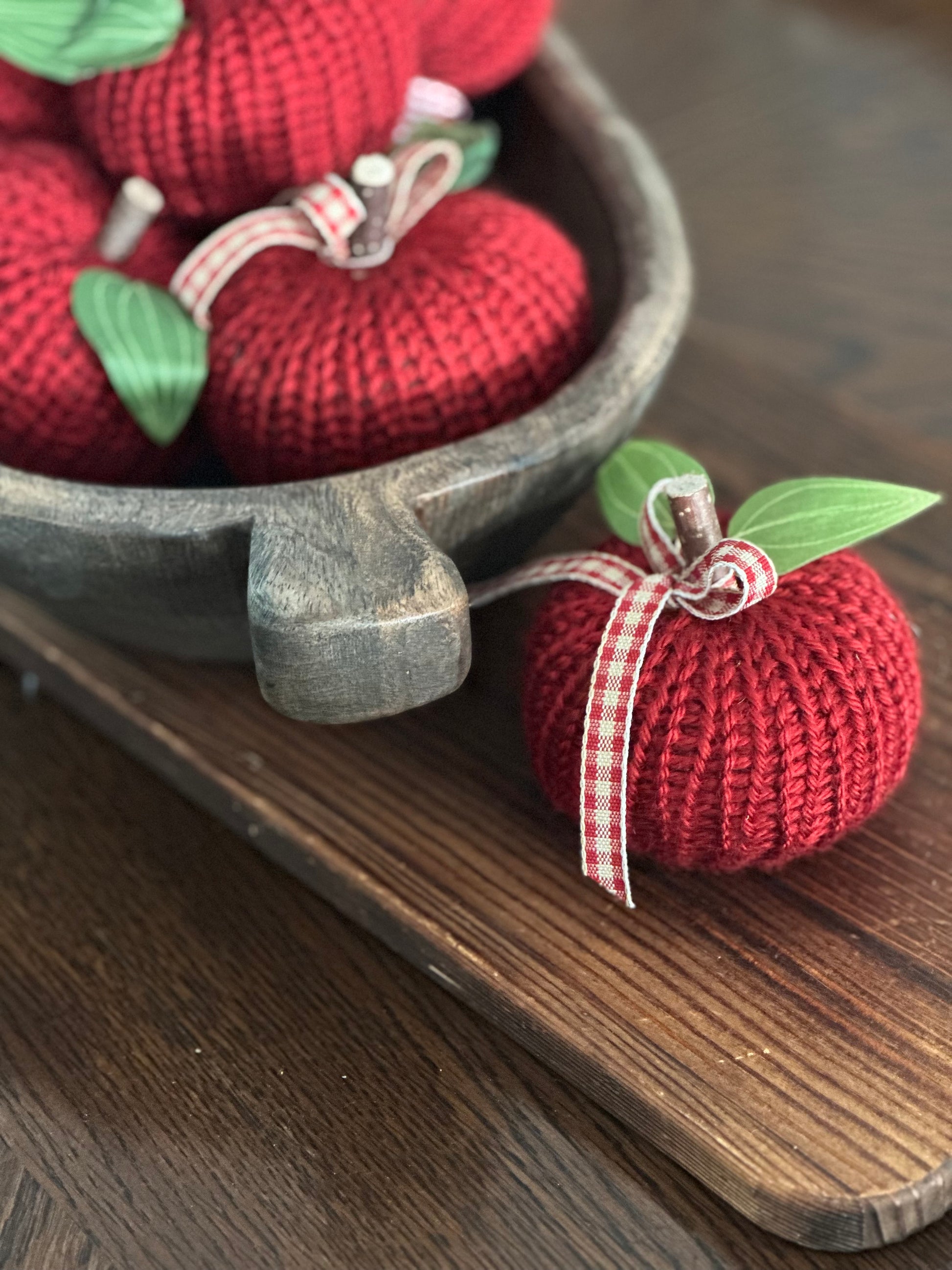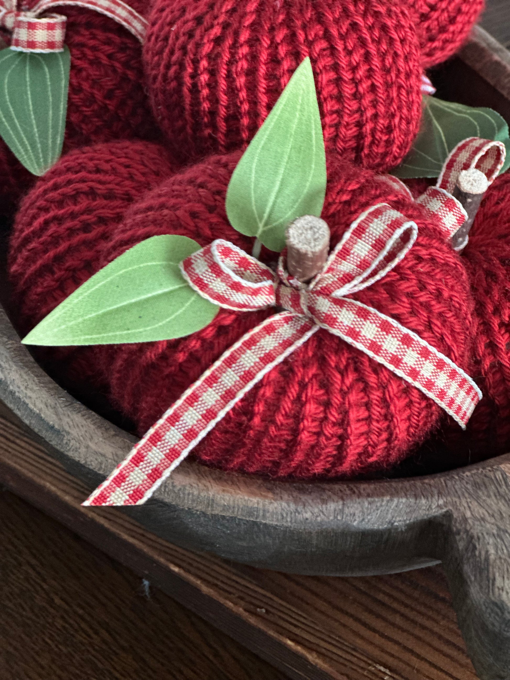 Handmade Knit Apple with Green Leaves – Cozy Farmhouse Fall Décor